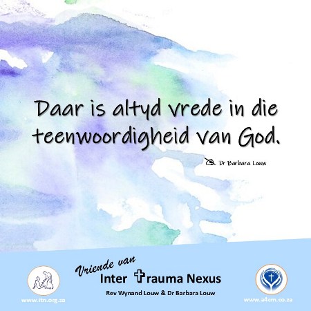 Johannes 14:27 NLV: Ek laat vir julle vrede na; my vrede deel Ek met julle. Ek gee nie soos die wêreld gee nie. Julle moet nie ontsteld of beangs word nie.